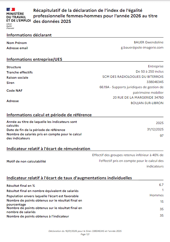 Déclaration de l’index de l’égalité professionnelle F/H 2026